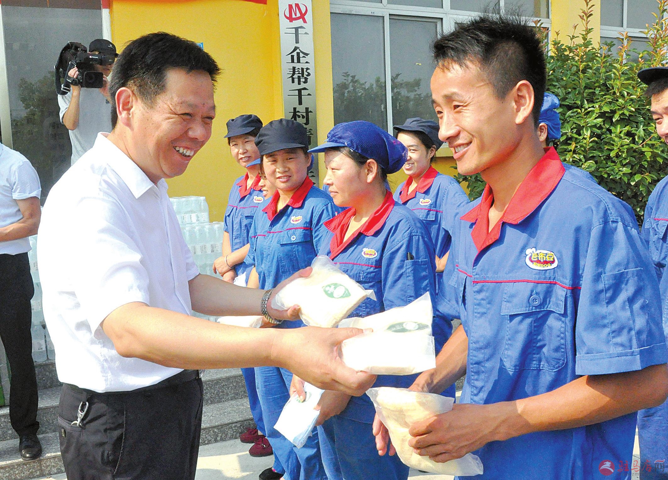 近日,正阳县委、县政府和县总工会负责人一行,来到河南百蓓佳卫生用品有限公司、正阳县文化体育中心项目建设现场、河南华豫恒通化工有限公司,看望慰问在高温一线作业的工人,并为他们送去矿泉水、毛巾、绿豆等慰问品。