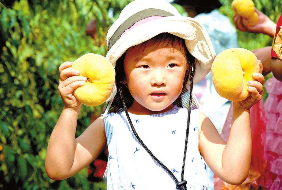 桃园里,孩子拍“萌照”。
