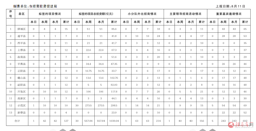 全市“迎盛会大招商”活动招商情况通报表(8月11日)