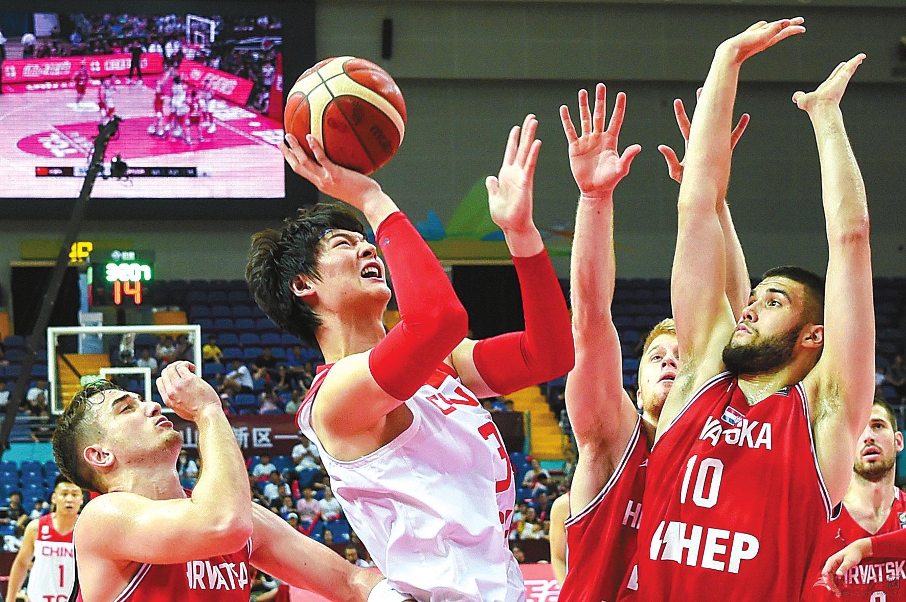 8月11日,中国队球员王哲林(左二)在比赛中投篮。当日,在江苏昆山举行的2019年“周庄杯”昆山国际男篮锦标赛中,中国队以89比73战胜克罗地亚队。新华社记者李博摄