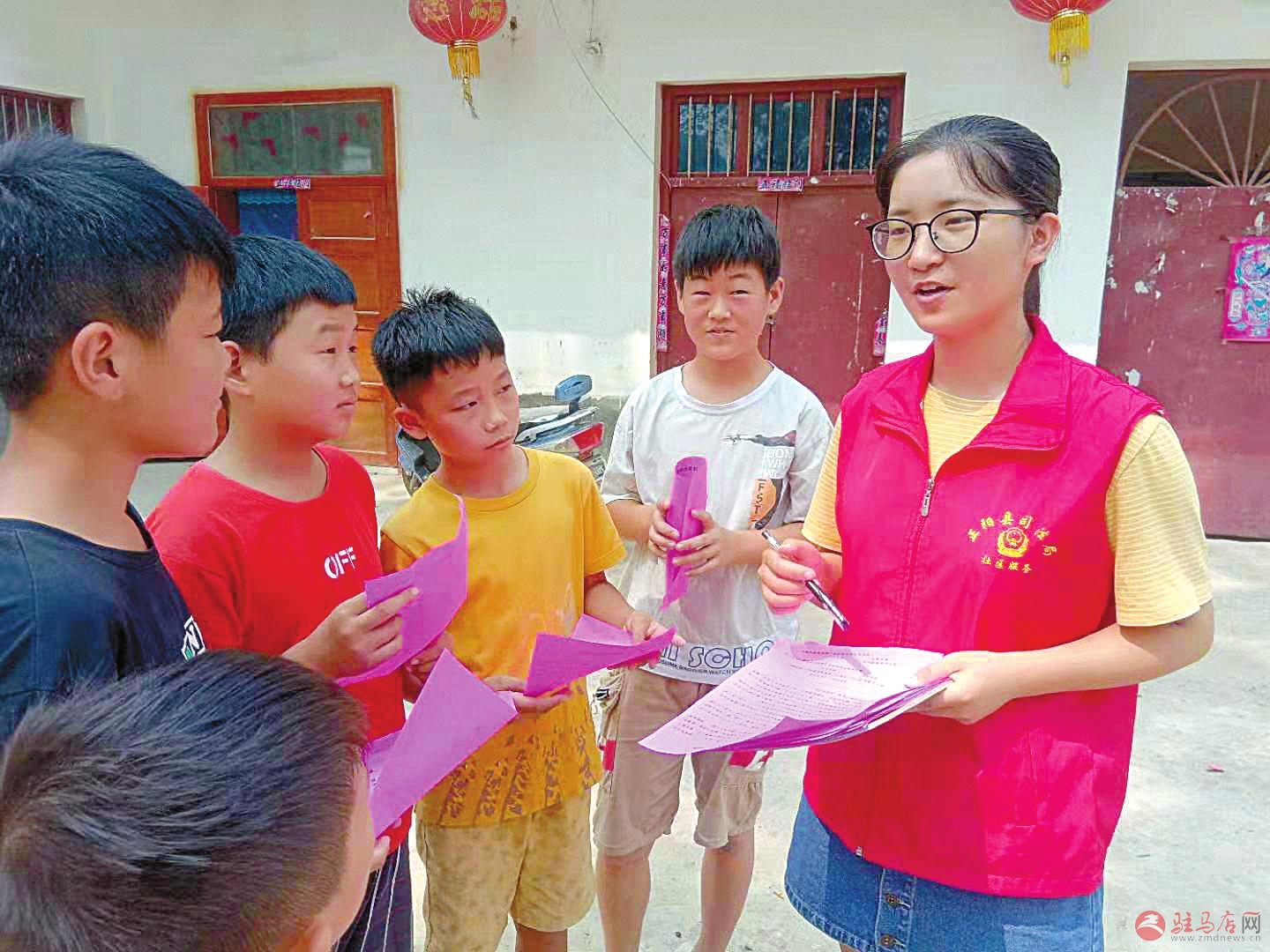 8月26日,参加社会实践活动的郑州大学大学生在正阳县真阳街道办事处张庄村向留守儿童讲解防溺水常识。暑假期间,该街道的30多名回乡大学生组成服务小分队,结合所学特长,组织开展留守儿童帮扶、心理辅导、文化宣传、科技兴农、文艺演出等活动,传递文明新风。