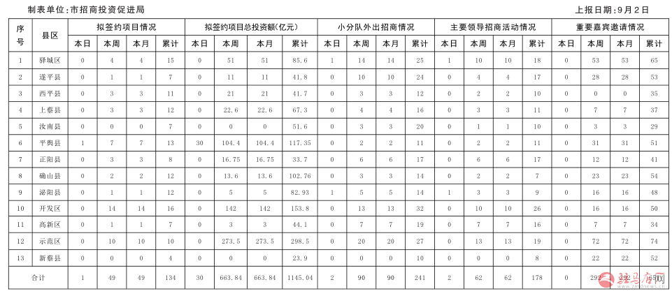 全市“迎盛会大招商”活动招商情况通报表
