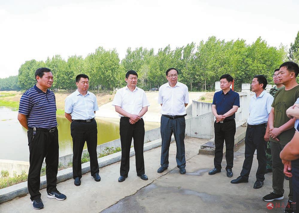 县委书记聂晓光(左三)等县领导在西平县水利局党组书记、局长焦春平(左一)陪同下,调研河长制工作。
