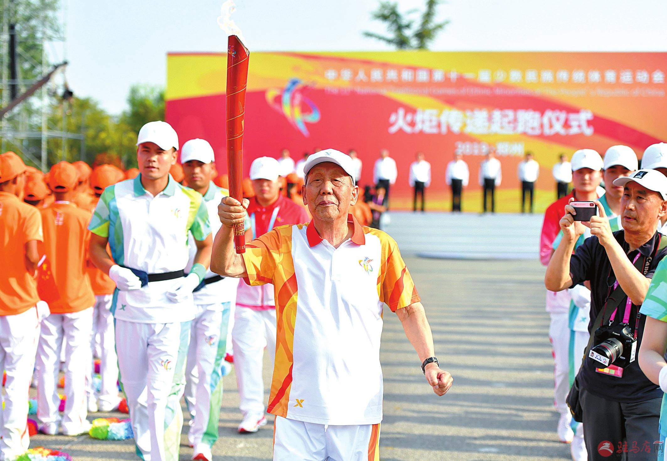 9月7日,第一棒火炬手张利修(中)在火炬传递活动中。当日,第十一届全国少数民族传统体育运动会实地火炬传递活动在郑州举行。新华社记者 李嘉南 摄