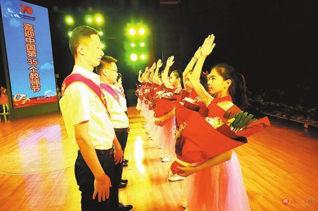 美德少年向“天中最美教师”献花致敬。