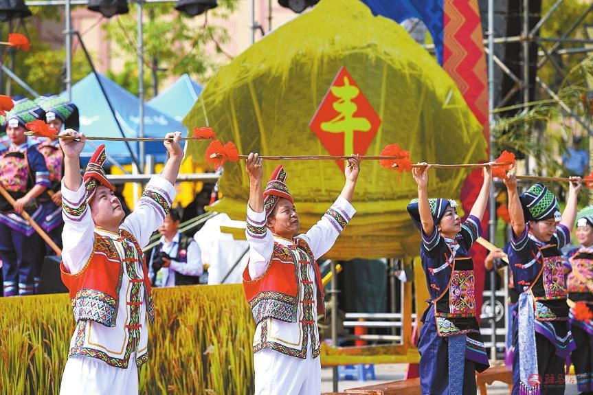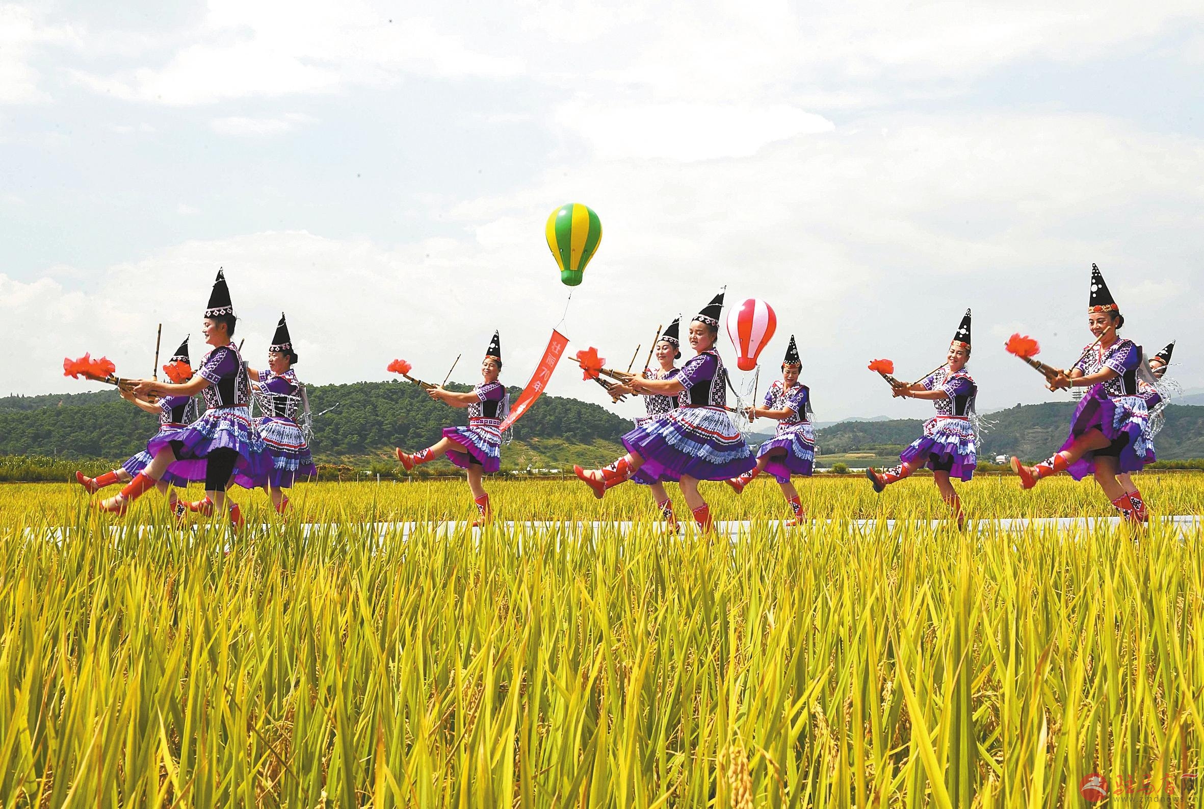 9月15日,人们在田野里表演舞蹈《吹响芦笙庆丰收》。金秋时节,云南省寻甸回族彝族自治县在七星镇鲁古村举行庆祝丰收活动。新华社发