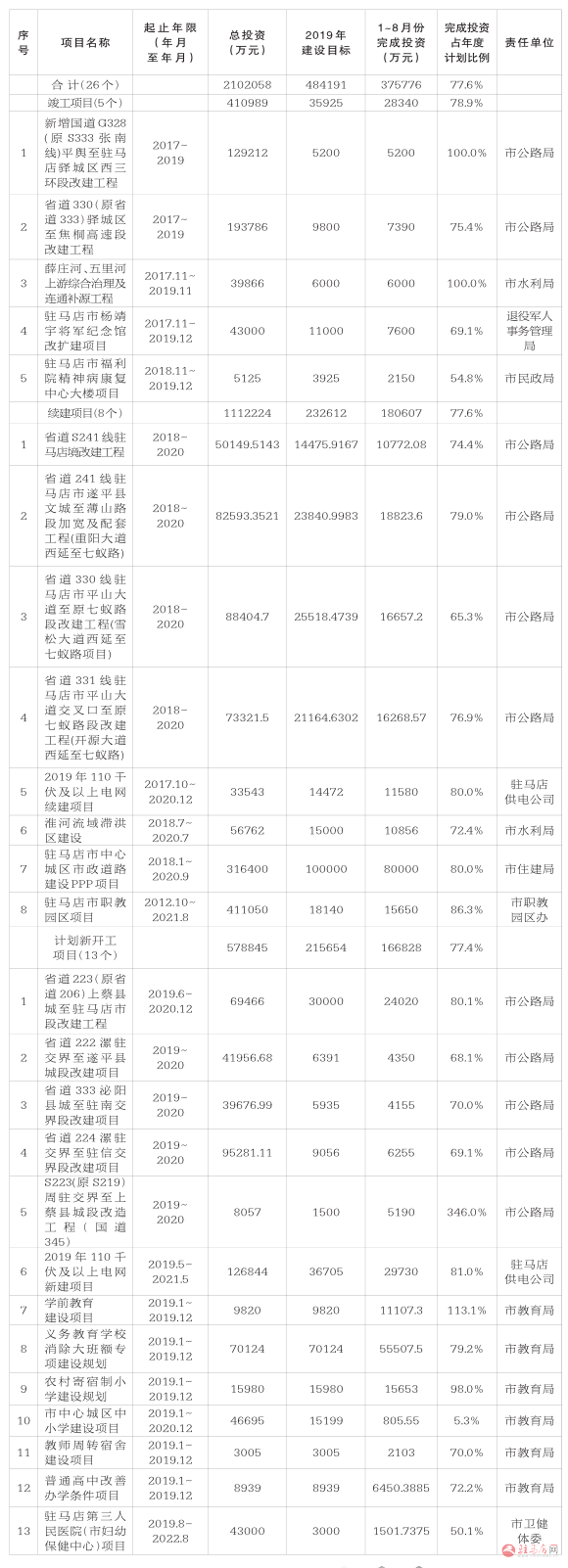 2019年市重点建设项目1~8月份进度情况表