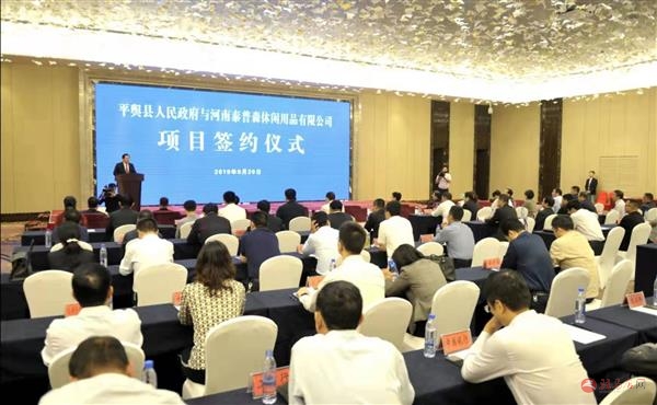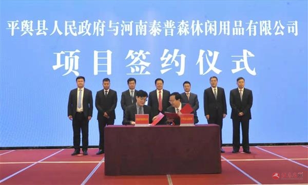本报讯(记者滑清泉高君瑞/文弓华静/图)9月20日,平舆县政府与河南泰普森休闲用品有限公司举行项目签约仪式,标志着双方进入紧密合作新阶段,对进一步做大做强我市户外休闲产业,促进我市乃至全省户外休闲产业快速健康发展具有重要推动作用。