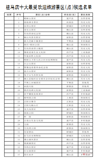 通过网络投票、专家评审、结果公布等环节,最终评选出2019驻马店“十大最受欢迎旅游景区(点)”。