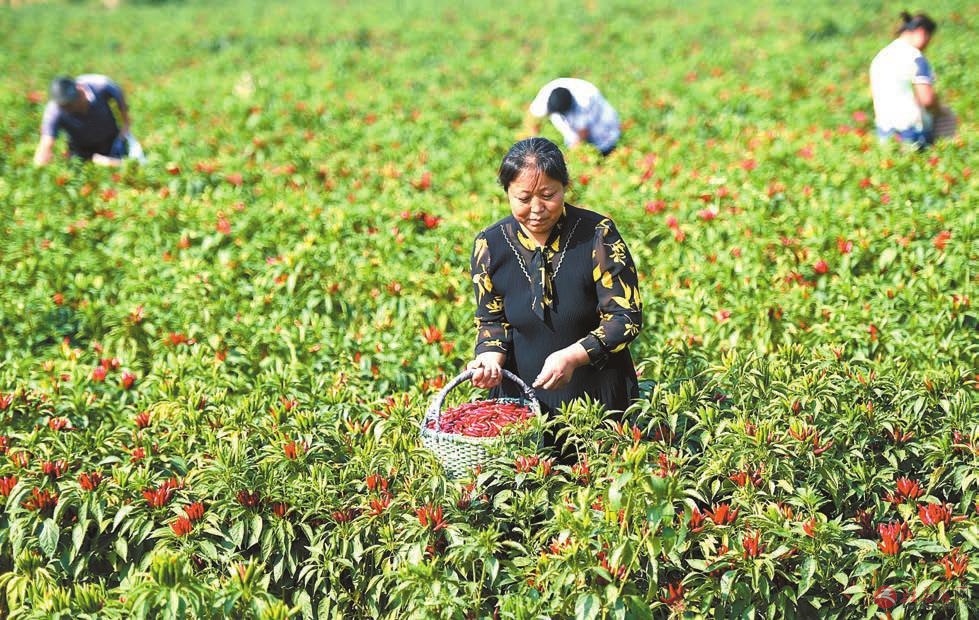 丰收时节,新蔡县韩集镇北泉寺村产业扶贫基地的300余亩辣椒进入成熟期,当地农民正忙碌地采摘火红的辣椒。近两年,当地引进种植的朝天椒8号因颜色亮、椒形好、辣度高,广受客户喜爱,远销四川、重庆等地市场,小辣椒长成了扶贫“大产业”,助力贫困户增收致富。