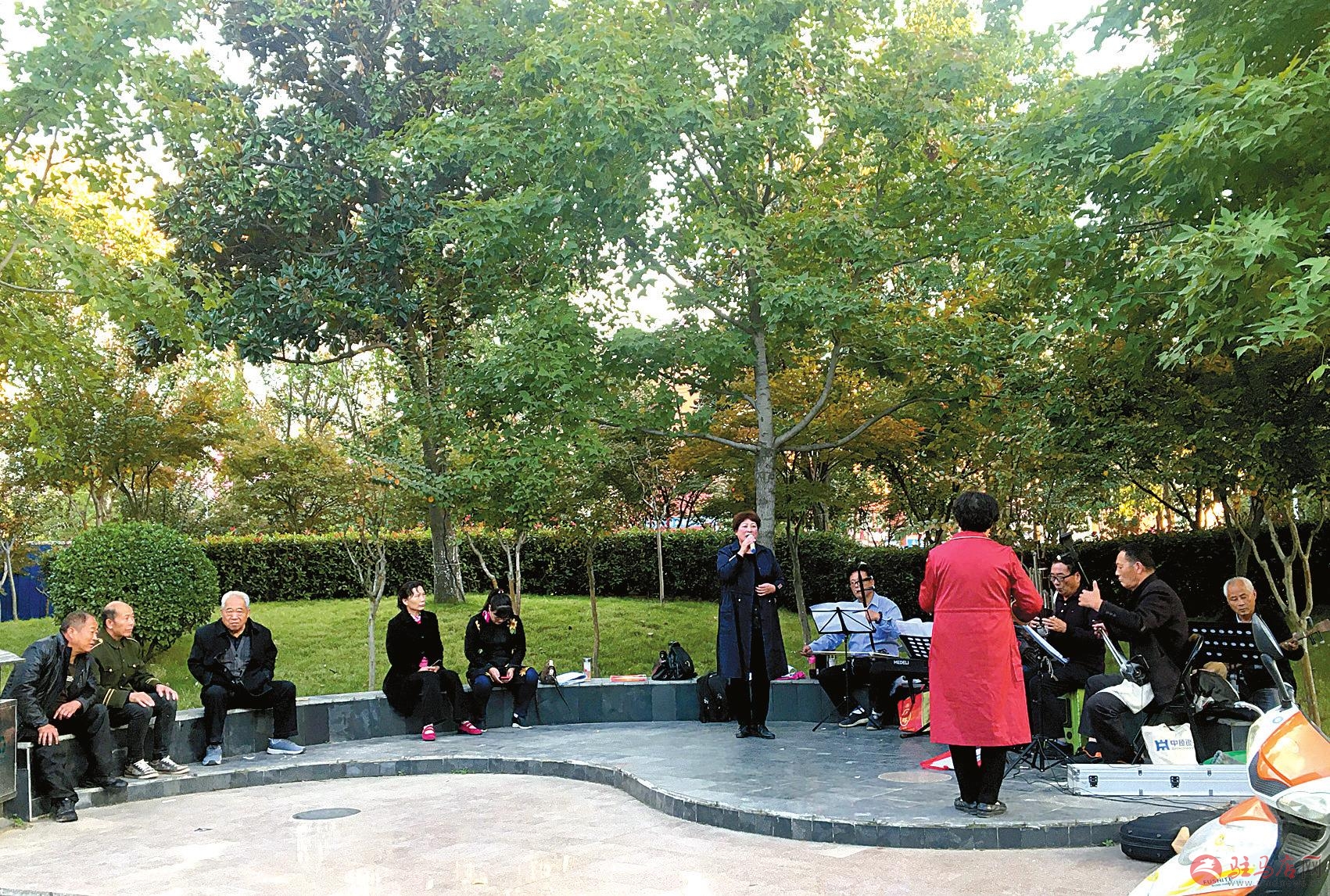 近日傍晚时分,记者走进市区交通路西段的重阳文化园,发现前来休闲消遣的人们络绎不绝,有围聚下象棋的退休大叔,有舞动身段的退休大妈,有踏着滑板车飞跑的快乐孩童,园内呈现一派快乐、祥和、幸福的景象,特别是公园东南角一帮老年戏曲爱好者的精彩演唱,更让休闲者饱食了戏曲文化大餐。