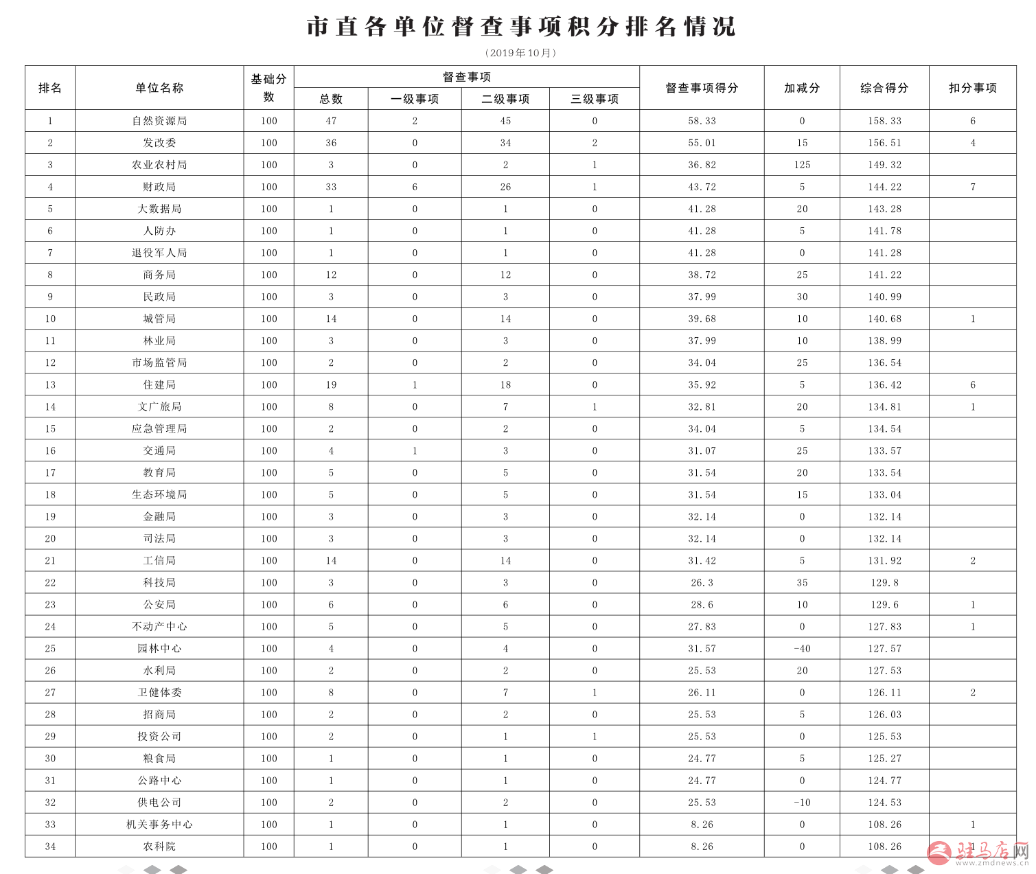 2019年10月,参与积分排名的事项共计224项,涉及县区13个、市直单位34个,其中市长批示件督办事项100项,市长安排重要事项121项,人大建议3件;本月加分扣分事项54项(包括督查工作通报14期)。经督查“一张网”系统大数据自动排名统计,现公布如下。