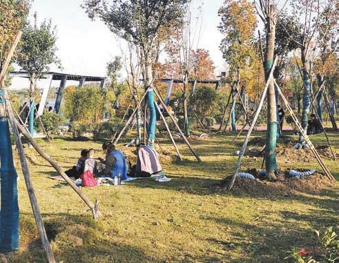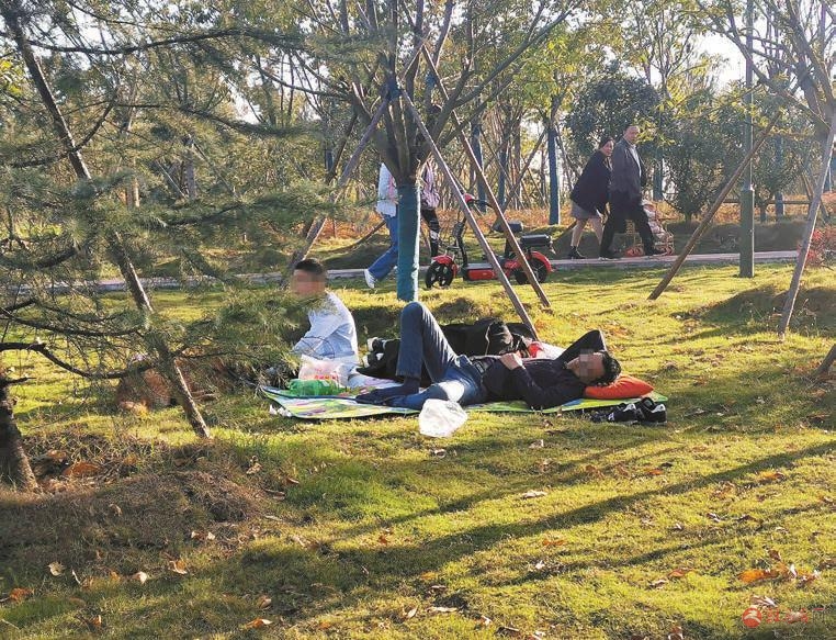 近日,在市区的景点内,市民在草地上睡觉、吃东西。