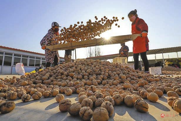 初冬时节,在河北省遵化市东旧寨镇,上万亩的核桃、板栗等山货喜获丰收,农民们忙着收储、整理、晾晒以待外销。11月10日,河北省遵化市东旧寨镇合丰农产品专业合作社的农民在筛选核桃。新华社记者 牟宇 摄