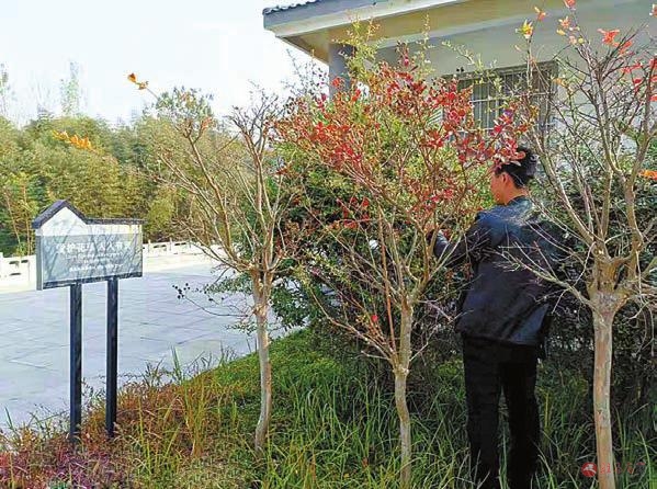 近日,在市区的景点内,一市民正在景观树旁摘树叶,还有市民把包和衣服挂在树枝上。