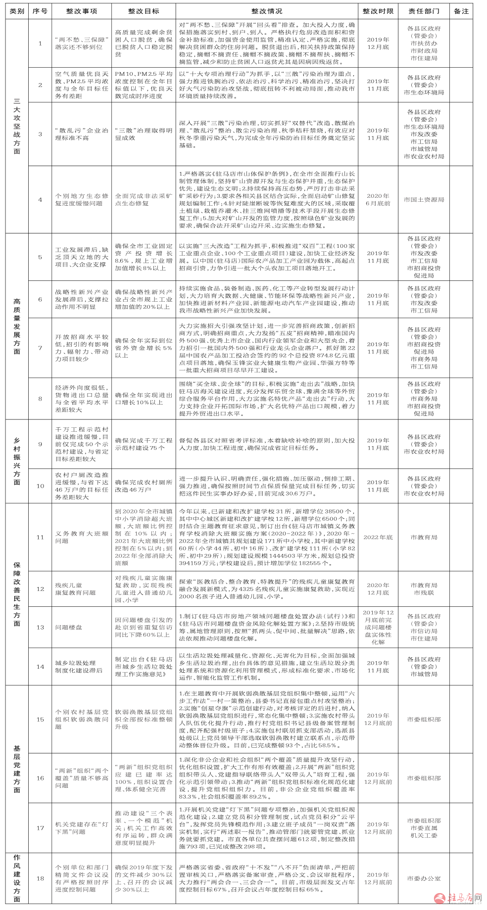 为认真落实中央、省委和市委关于“开门抓教育”的有关要求,驻马店市围绕贯彻落实习近平新时代中国特色社会主义思想和习近平考察河南时重要讲话精神,聚焦深化供给侧结构性改革、打好“三大攻坚战”、实施乡村振兴战略、推进高质量发展等重大任务,针对群众最急最忧最盼问题,认真开展调查研究、广泛征求意见、真情回应群众期盼,以“抓铁有痕、踏石留印”的精神抓好整改落实。现将开展主题教育前期检视出来的重点问题整改落实推进情况公示如下,热诚欢迎、真诚接受社会各界的监督和评判。