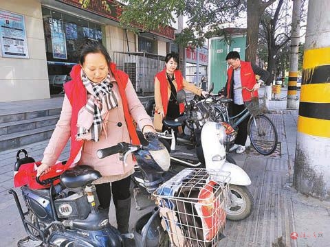11月14日,驻马店日报社志愿者摆放路边电动车。记者 邓桦 摄