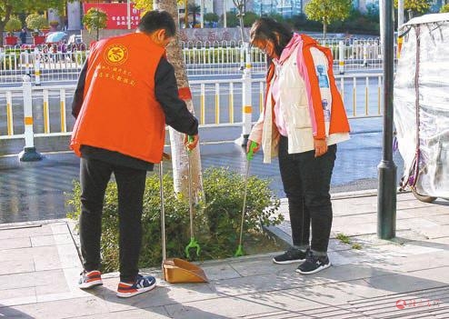 11月14日,志愿者在市区开源大道打扫街面。记者 李旻 摄