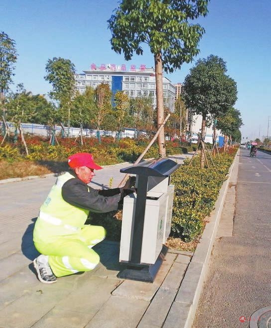 开发区环卫工人正在擦洗路边果皮箱。 记者 唐翀 通讯员 高晓丽 摄影报道