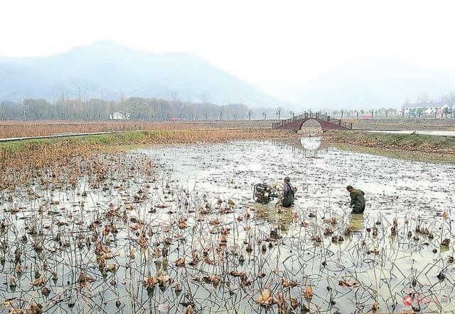 近日,在确山县瓦岗镇常庄村的荷塘里,农民们正在忙着收获莲藕。