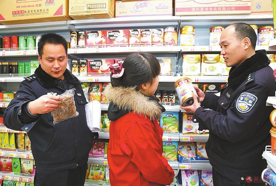 上蔡县公安局重阳派出所民警深入辖区内超市,对奶粉等包装类食品进行安全检查。