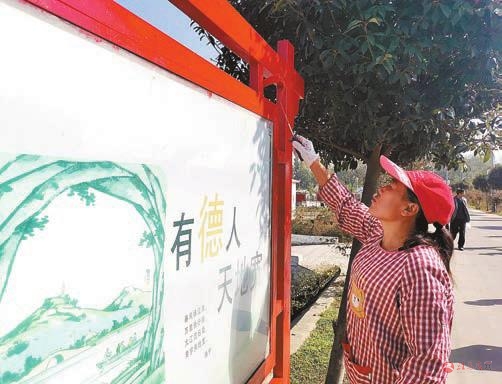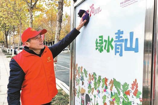 志愿者擦拭文明宣传栏的灰尘。记者邓桦摄