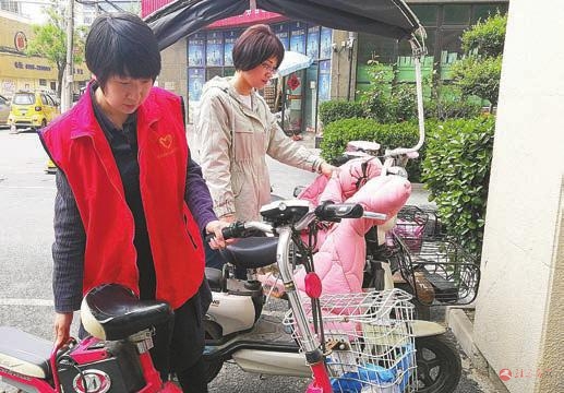 志愿者整理路边乱停的电动车。记者邓桦摄