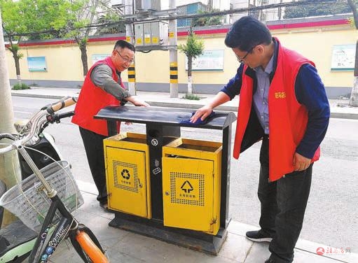 志愿者清理路段垃圾箱的卫生。记者邓桦摄