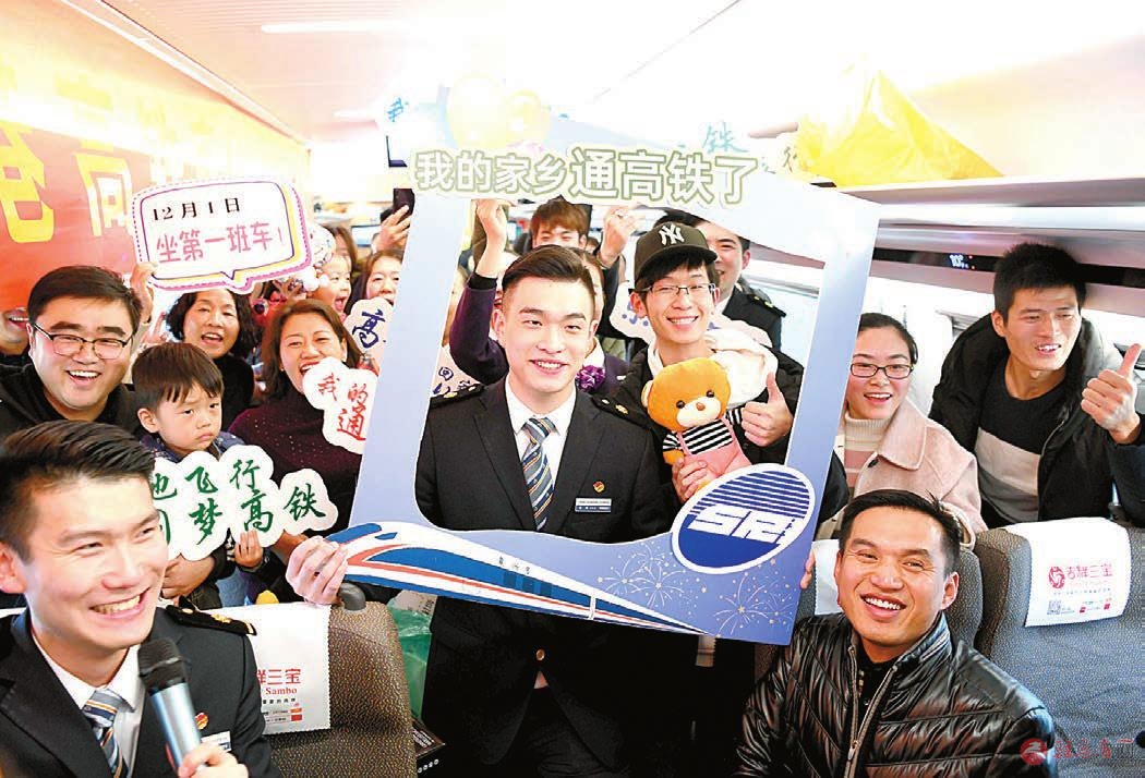 合肥客运段工作人员和旅客在阜阳西站开往上海虹桥站的G7787首发列车上合影。