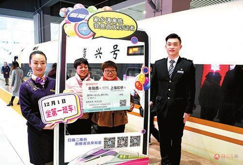 旅客在阜阳西站与阜阳西站开往上海虹桥站的G7787首发列车合影留念。