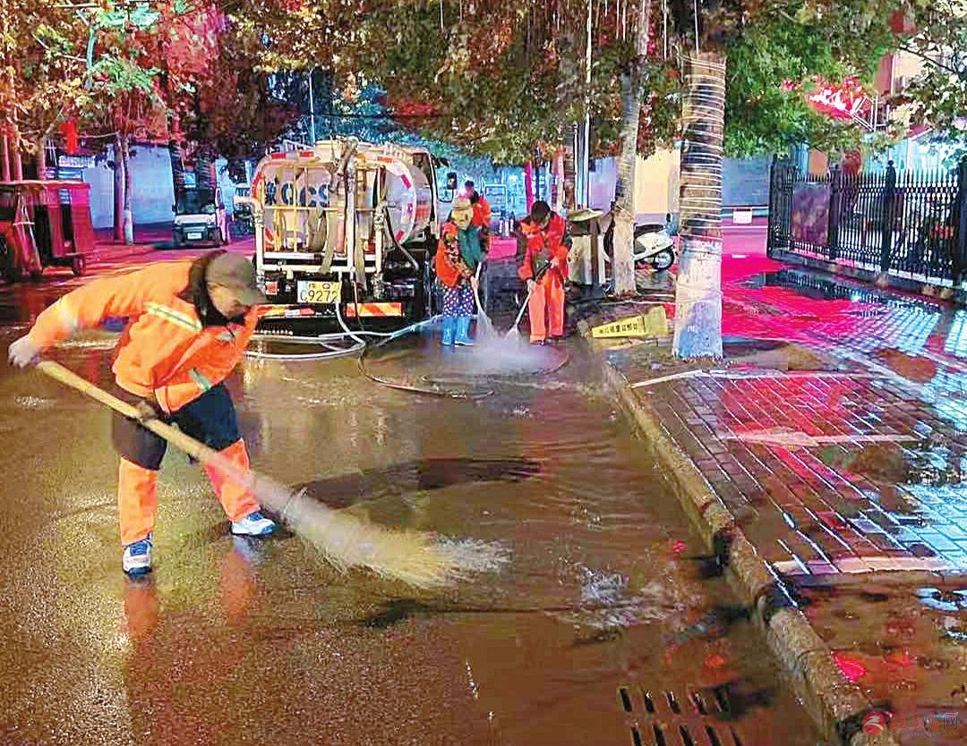 环卫工人正在冲刷街道。 记者 李旻 摄