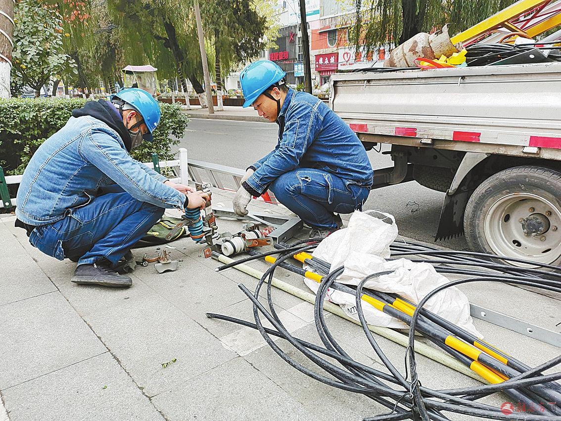 供电部门有关人员在市区骏马路中段抢修供电线路。记者 邓桦 摄