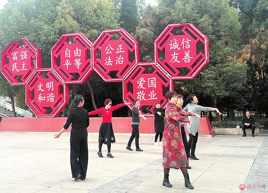 市民在文化广场跳舞健身。 记者 李旻 摄