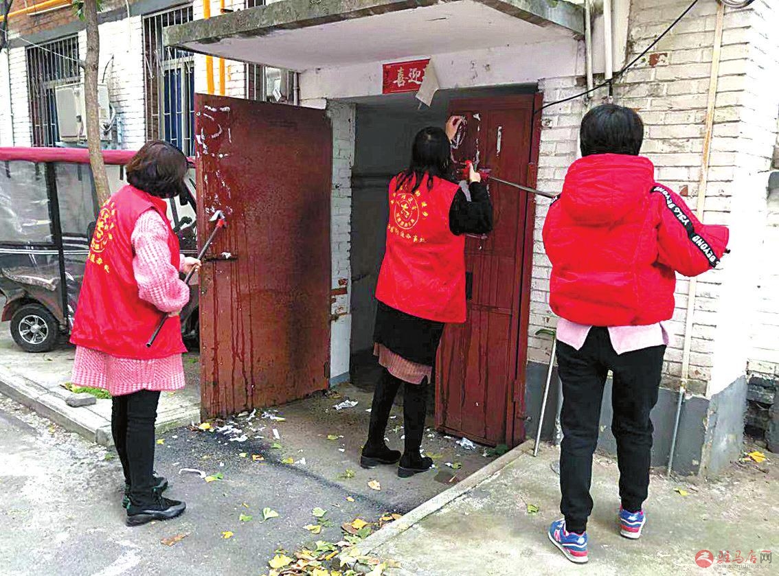 驿城区西园街道办事处志愿者对辖区家属院的环境卫生进行清扫。记者 郑付生 通讯员 秦东升 摄影报道