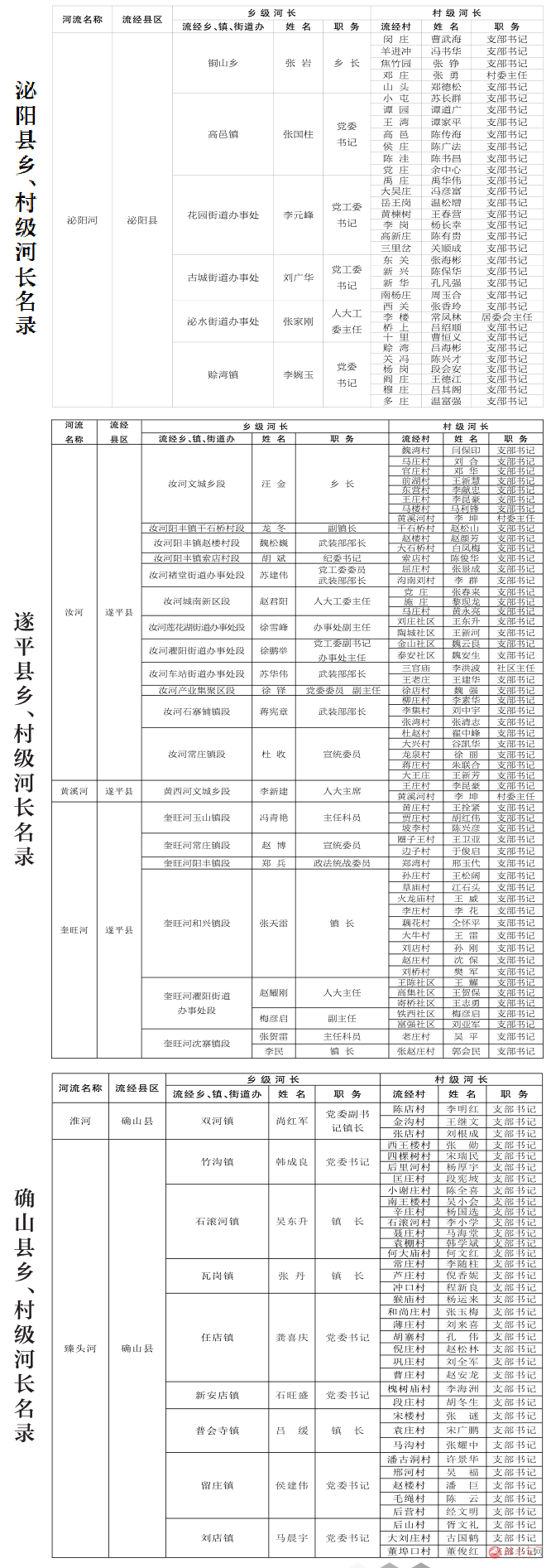根据《中共驻马店市委办公室驻马店市人民政府办公室关于印发〈驻马店市全面推行河长制工作方案〉的通知》(驻办文〔2017〕53号)和《驻马店市河长制办公室关于印发〈驻马店市市级河长调整方案〉的通知》(驻河〔2019〕6号),市级河长负责的河湖流经县区的河段,其河长名单由市河长制办公室予以公布。