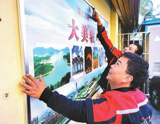 橡林街道办事处安排人员在市区平安街安装文明宣传板面。记者 邓桦 摄