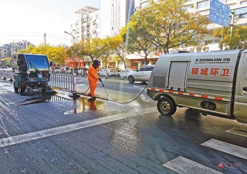 市区交通路上,环卫人员一边冲刷路面,一边清扫垃圾。记者 邓桦 摄