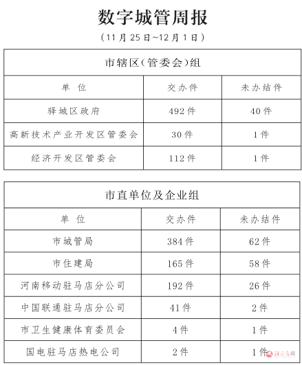 驻马店市智慧城市管理中心11月25日~12月1日通过采集员、网格员采集上报、视频抓拍、市民举报、领导交办等途径受理各类城市管理案件2574件,按时办结2382件,超时未办结192件,所有案件均通过数字城管系统派遣交办至18个联动单位。经核实,截至12月1日18时,存在超时未办结案件的单位共9个,详细情况如下:
