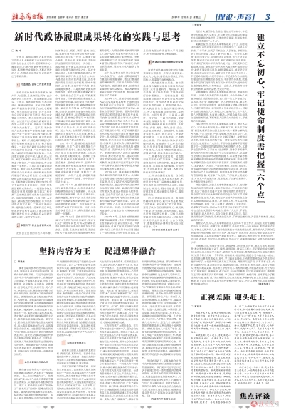 坚持内容为王,是媒体融合过程中决不能忽视的原则,是媒体应对竞争的重要原则。我们要以习近平总书记关于新闻工作的一系列重要讲话精神为指导,从讲政治的高度坚持内容为王,从谋长远的深度坚持内容为王,从促发展的热度坚持内容为王,认真践行“四力”,促进媒体融合,迎接竞争挑战,围绕中心服务大局,以更加有力有效的方式、更具深度温度的精品、更能亲近受众的作风开创媒体业发展的新辉煌。