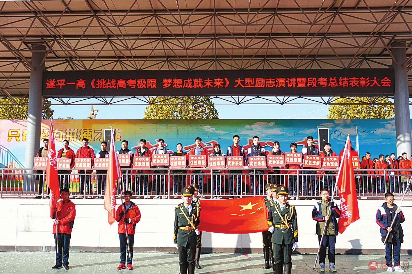 日前,遂平县第一高级中学“挑战高考极限梦想成就未来”大型励志演讲暨段考总结表彰大会在该校操场举行,高三全体师生和学生家长4000人参加了活动。此次活动,点燃了学生的学习激情,坚定了学生的理想信念。