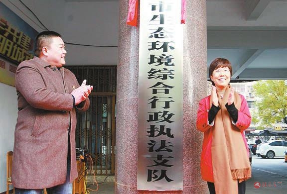 市生态环境局党组书记、局长郭丽君(右)为市生态环境综合行政执法支队成立揭牌。黄育南 摄