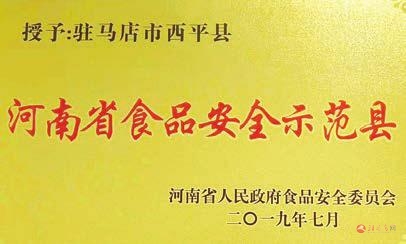 近日,从河南省政府食品安全委员会传来喜讯:西平县荣获省级食品安全示范县称号。这是继泌阳县后,驻马店第二个成功创建省级食品安全示范县的县区。