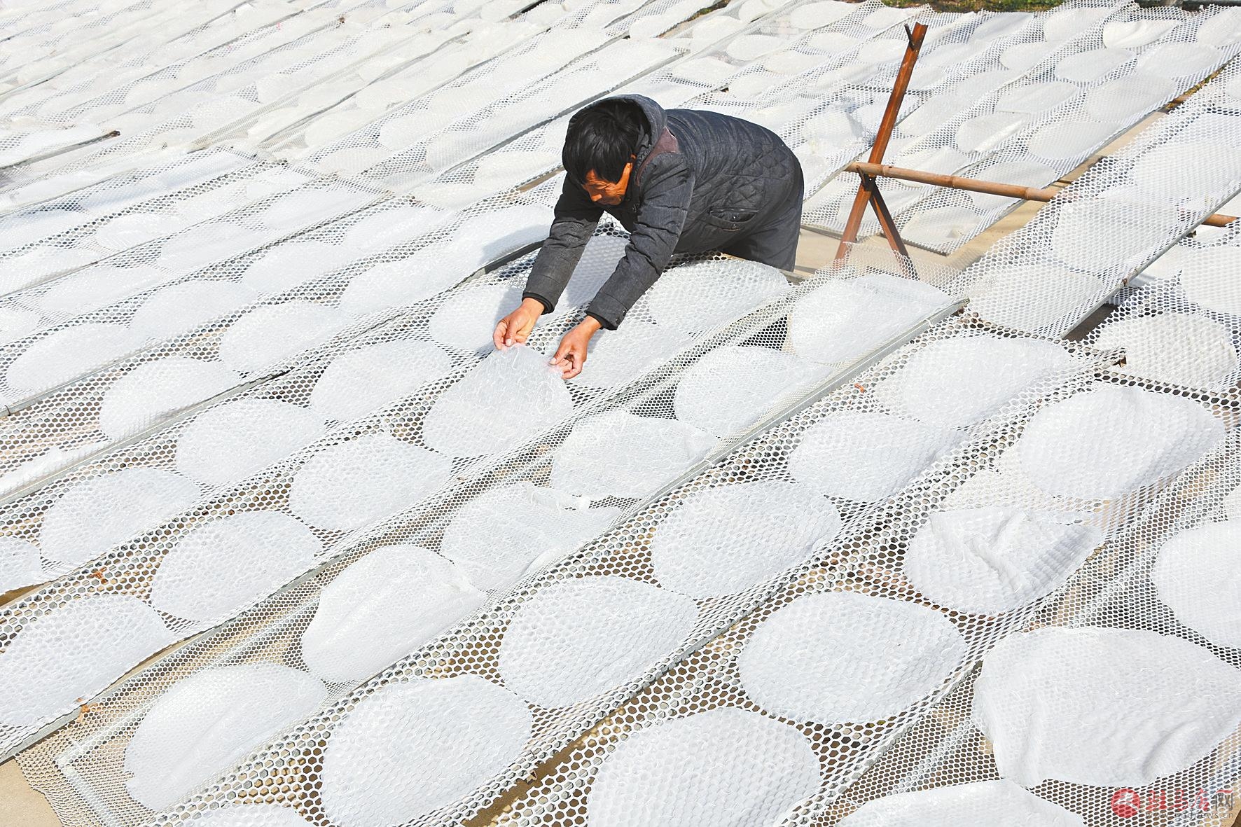 12月23日,正阳县永兴镇赵庙村群众在加工晾晒粉皮。冬闲时节,正阳县各乡村的村头院落到处是一片忙碌的景象,农民群众利用当地优质的红薯,进行特色粉皮、粉条加工等工作,拉长产业链、增加附加值,实现冬闲增收。