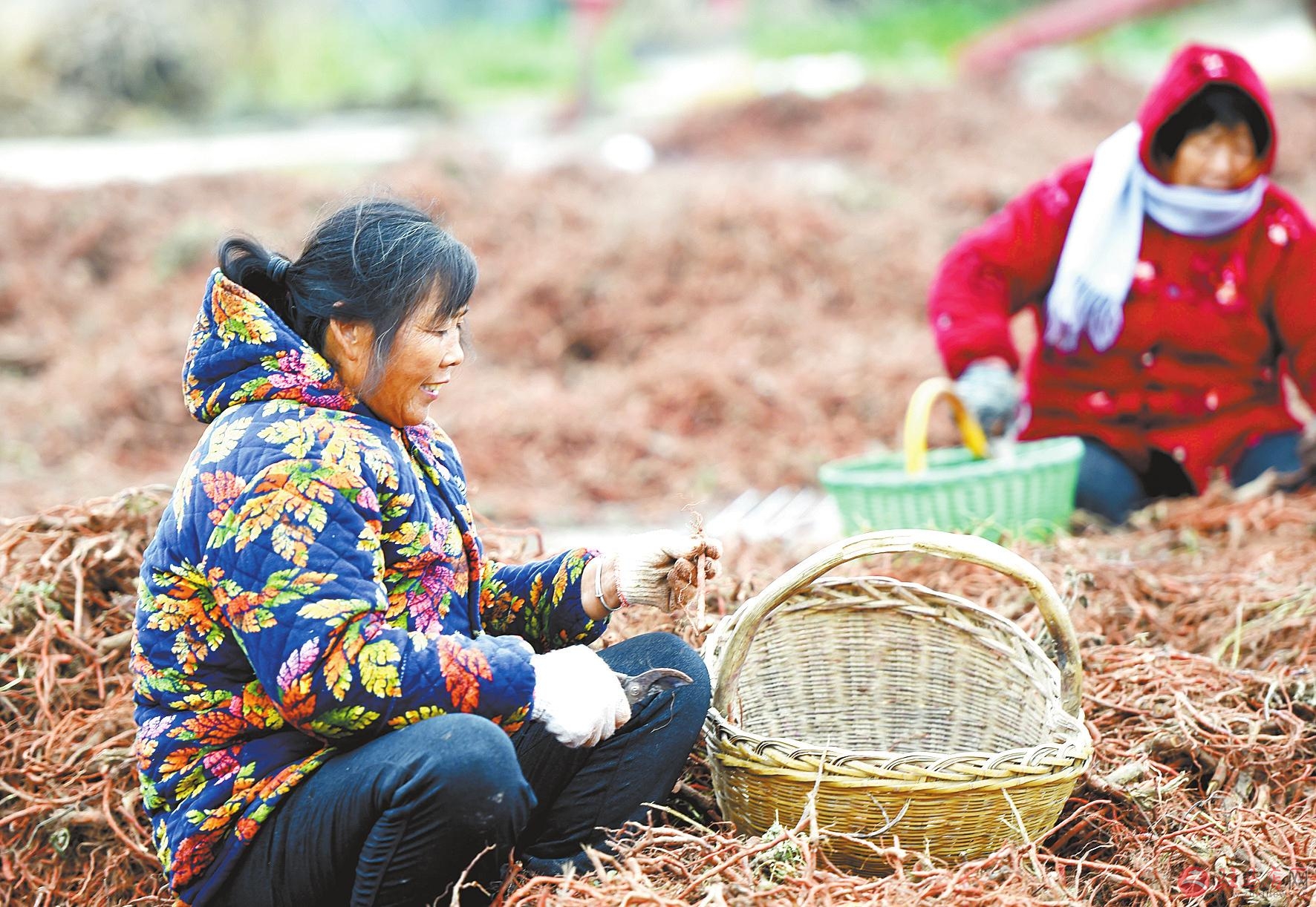 村里的留守妇女实现了家门口就业,正在地里收获优质丹参。