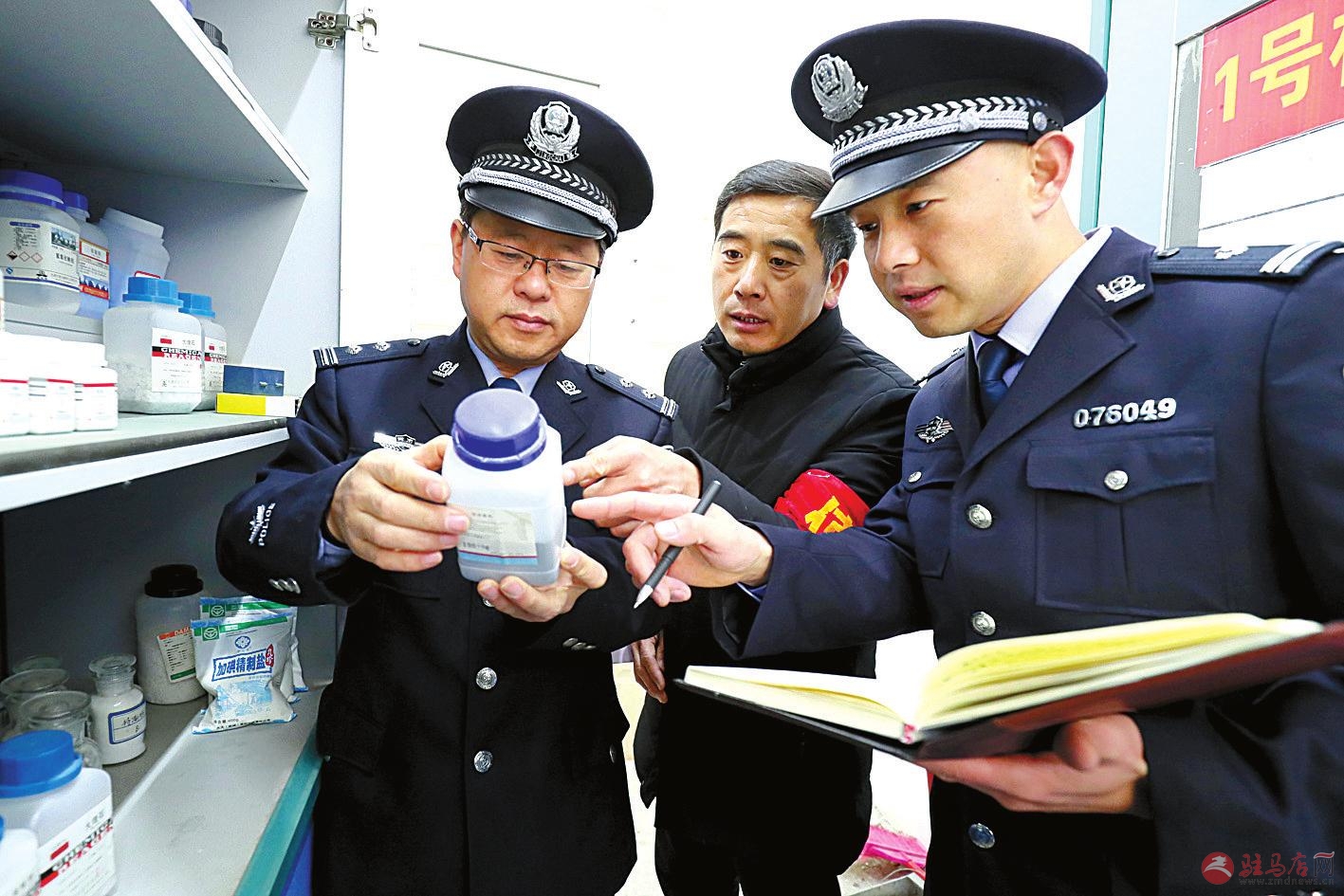 近日,新蔡县公安局治安大队联合辖区公安派出所,组织民警深入辖区中小学校,对学校实验室所用易制爆危险化学品的存储、安全管理、监控视频、消防应急处置等情况进行检查,并结合典型案例对学校管理人员进行安全教育。图为民警对辖区中学实验室易制爆危险化学品进行安全检查。