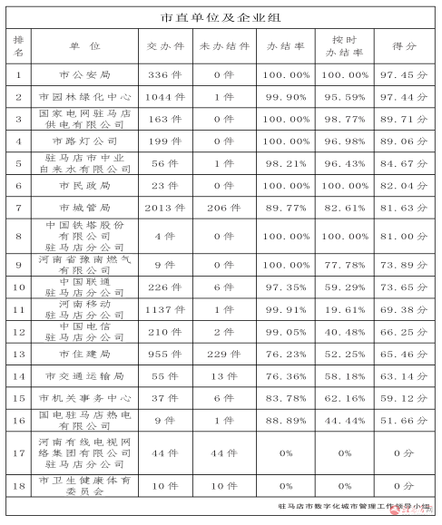 2019年12月份,驻马店市智慧城市管理中心通过采集员、网格员采集上报、视频抓拍、市民举报、领导交办等途径受理各类城市管理案件18102件,其中本月应结案17700件,已结案16239件,超期未办结1092件,因确权争议未处置案件369件,结案率91.75%。所有案件均通过数字城管系统派遣交办至18个联动单位,现将2019年12月份市中心城区数字化城市管理工作考评排名情况通报如下:
