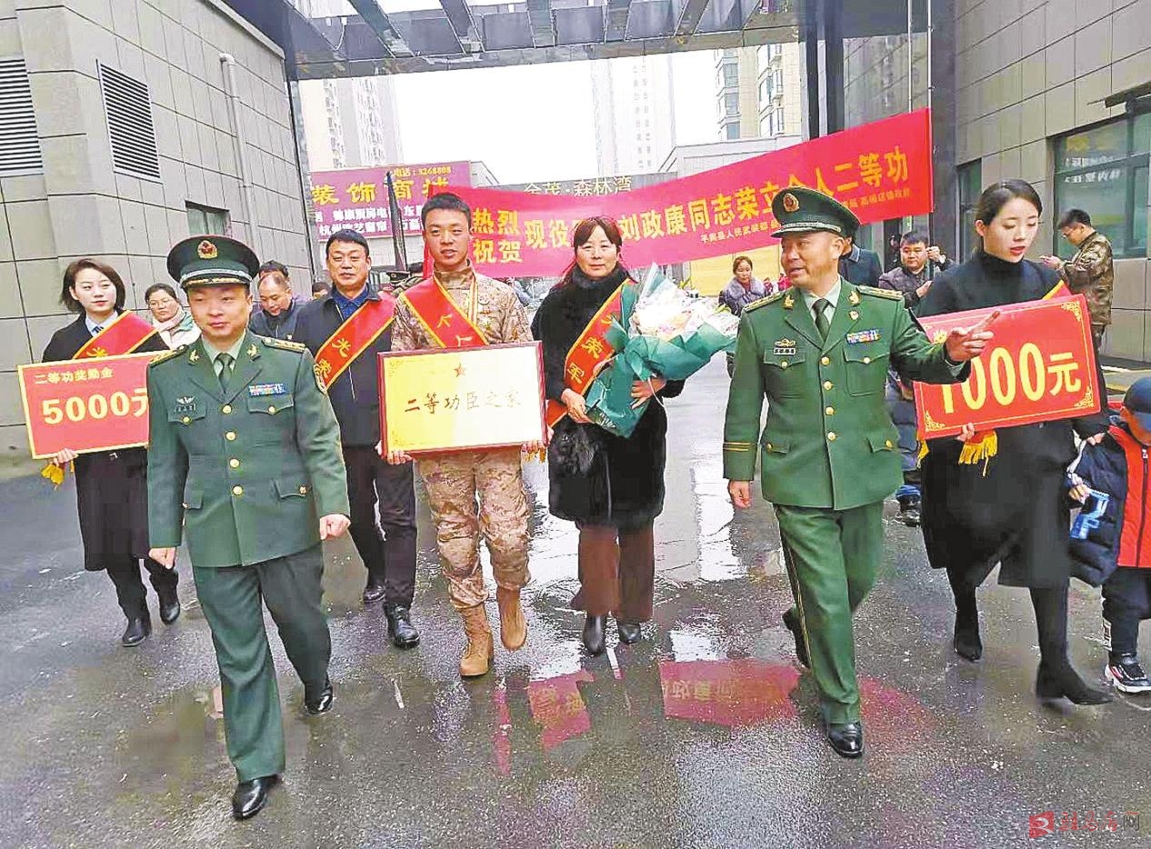 在中国人民解放军陆军第72集团军某部服役的平舆县高杨店镇籍战士刘政康,不怕吃苦、严格要求、刻苦训练,被部队评为“军事训练标兵”“全军优秀人才奖三等奖”,先后荣立个人“二等功”一次、“三等功”一次。图为1月9日,刘政康所在部队领导和平舆县人武部、平舆县退役军人事务局及乡镇领导,为刘政康家属送喜报。记者 王新军 通讯员 杨东周 摄影报道