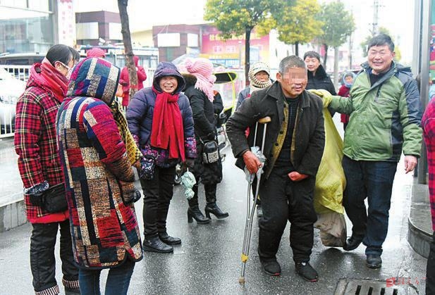 残疾流浪者在热心群众的帮助下,送往救助站。