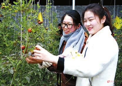 温棚种植的巧克力番茄吸引游客驻足观赏。