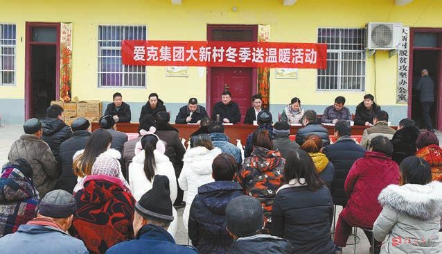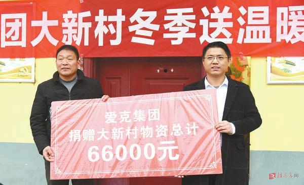 1月15日,驻马店驻报传媒集团联合驻马店爱克集团在汝南县三门闸街道办事处大新村举行冬季送温暖活动,为大新村捐赠价值6.6万元的新春节日礼品。驻马店驻报传媒集团、爱克集团、三门闸街道办事处、大新村委相关负责人出席捐赠仪式。